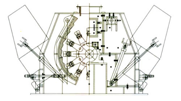 在PCXK可逆式防堵細(xì)碎機(jī)的中央布置有轉(zhuǎn)子,轉(zhuǎn)子帶動錘頭作高速圓周運(yùn)動,對稱于轉(zhuǎn)子兩側(cè)有可調(diào)節(jié)的破碎齒板,破碎齒板可隨側(cè)蓋作開放性打開,特殊設(shè)計的齒板與錘頭的運(yùn)動軌跡構(gòu)成破碎腔,從進(jìn)料口處落下的物料,首先被高速旋轉(zhuǎn)的錘頭擊向破碎齒板,隨即又被齒板反彈向向錘頭或其它破碎齒面,物料在破碎腔中如此來回跳動,并在運(yùn)動過程中相互碰撞,被進(jìn)一步擊破,達(dá)到設(shè)計粒度的物料從破碎機(jī)底部的出料口排出。出料粒度可由調(diào)節(jié)機(jī)構(gòu)調(diào)整控制。
