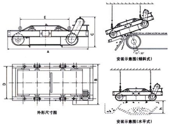型號 | 項目 → | 使用帶寬 | 額定吊高 | 磁場強度 | 物料厚度 | 勵磁功率 | 驅動功率 | 適應帶速 | 重量 | 外形尺寸mm | ||||